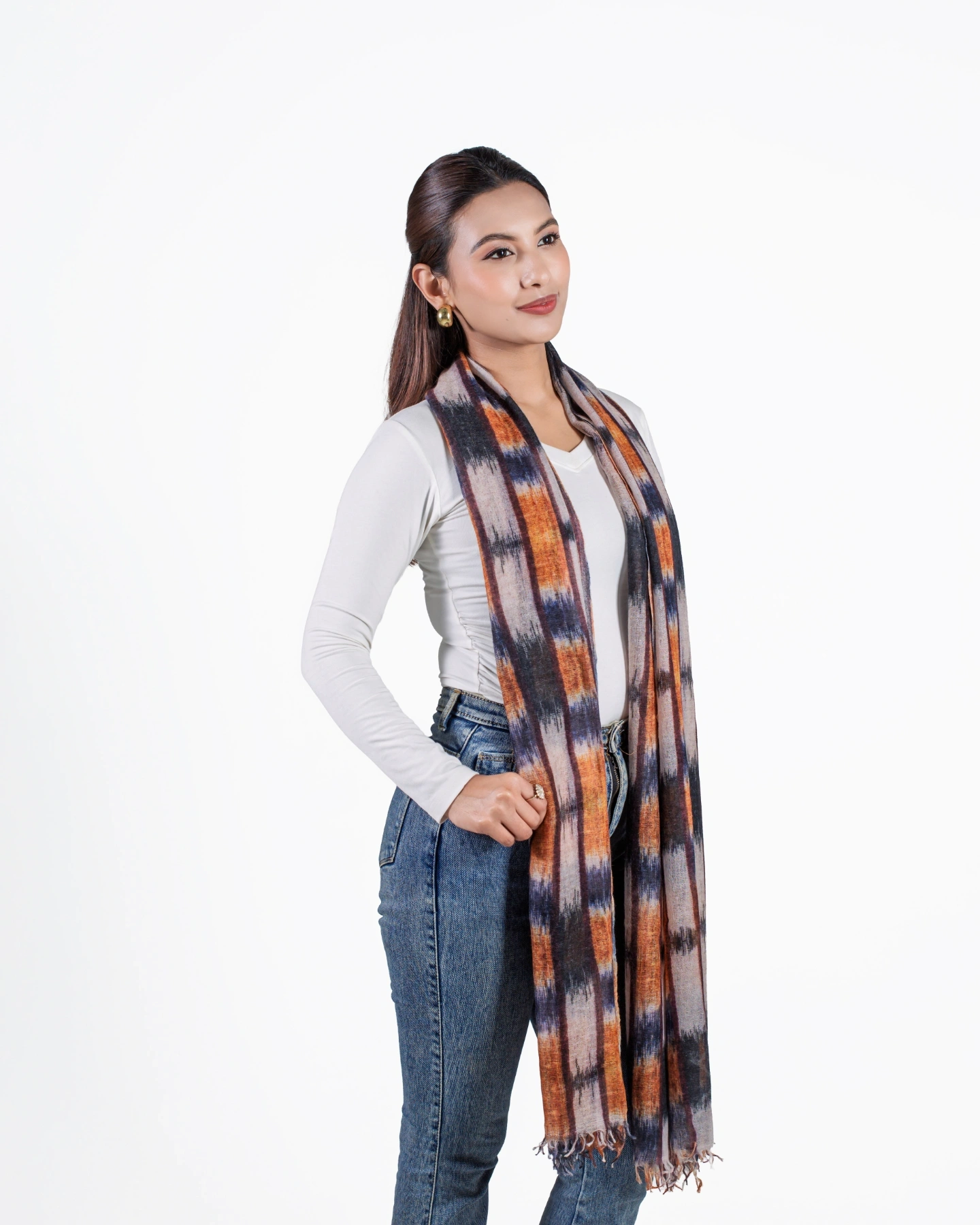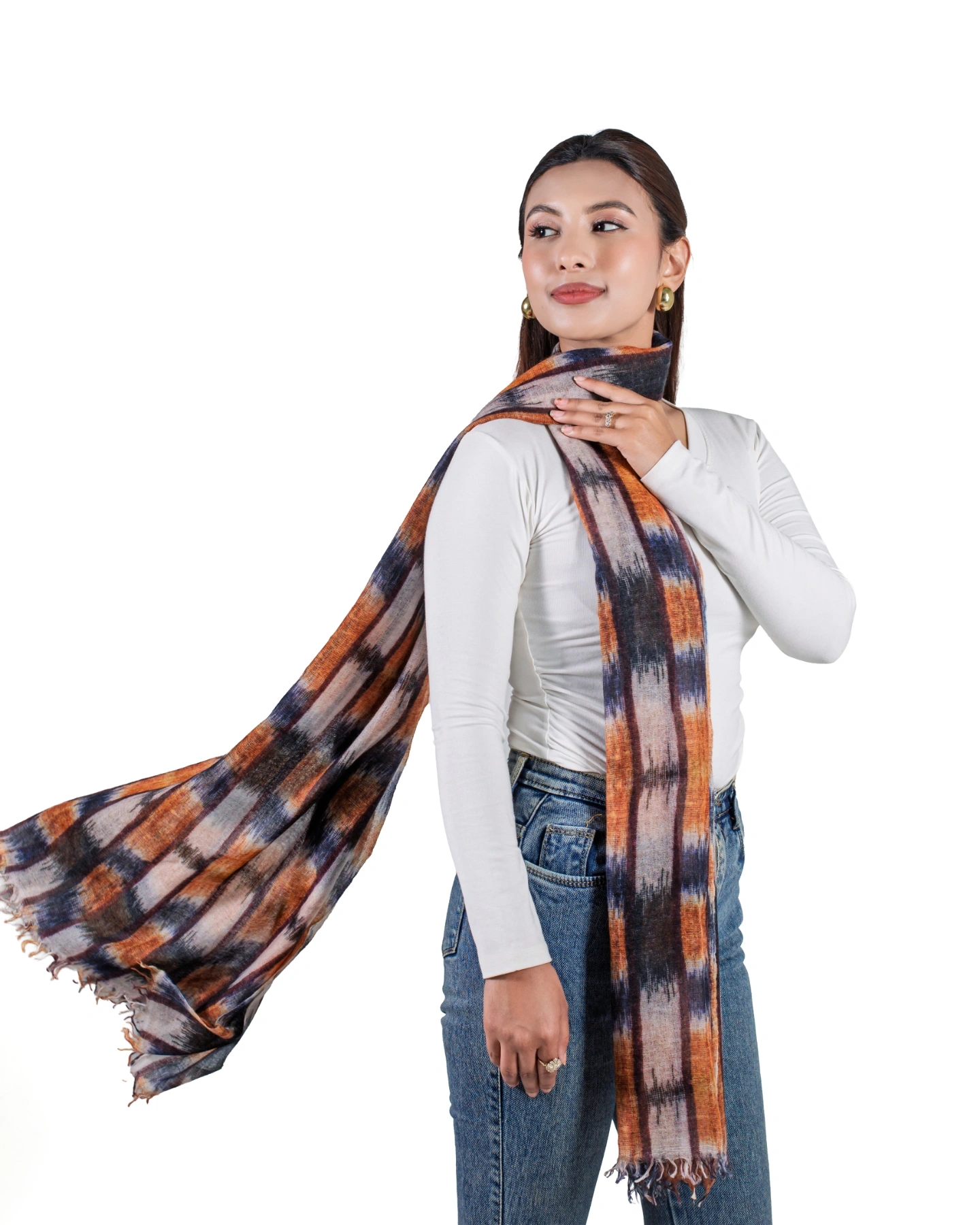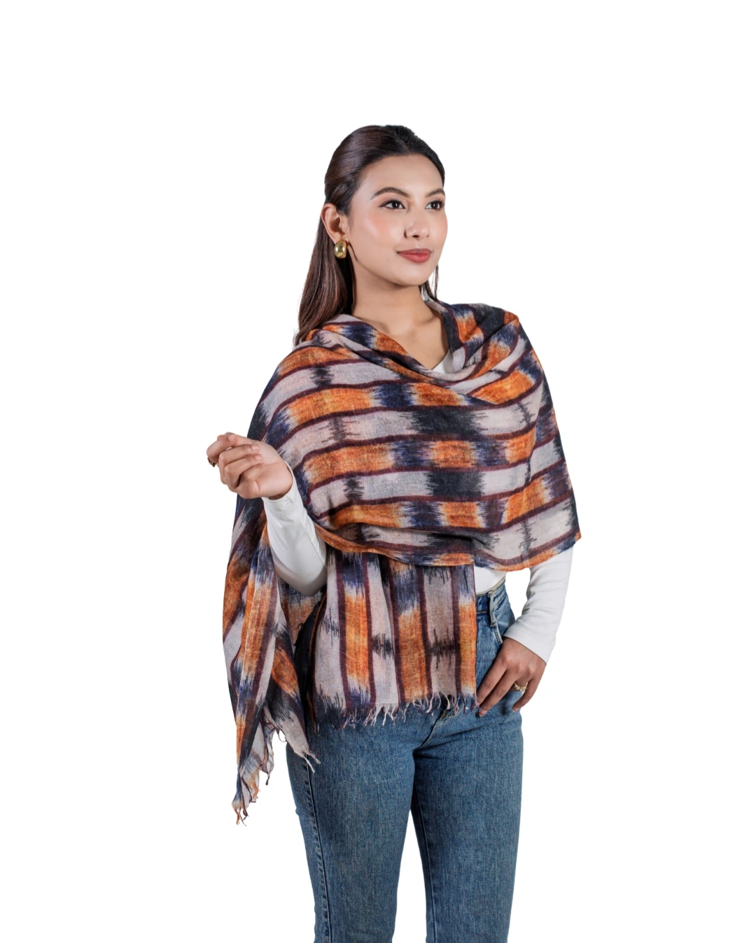 Crafted from 100% pure cashmere, this shawl features a bold black and rust geometric pattern. Soft, lightweight, and versatile, it drapes effortlessly as a wrap, stole, or statement accessory, perfect for both formal occasions and everyday elegance.