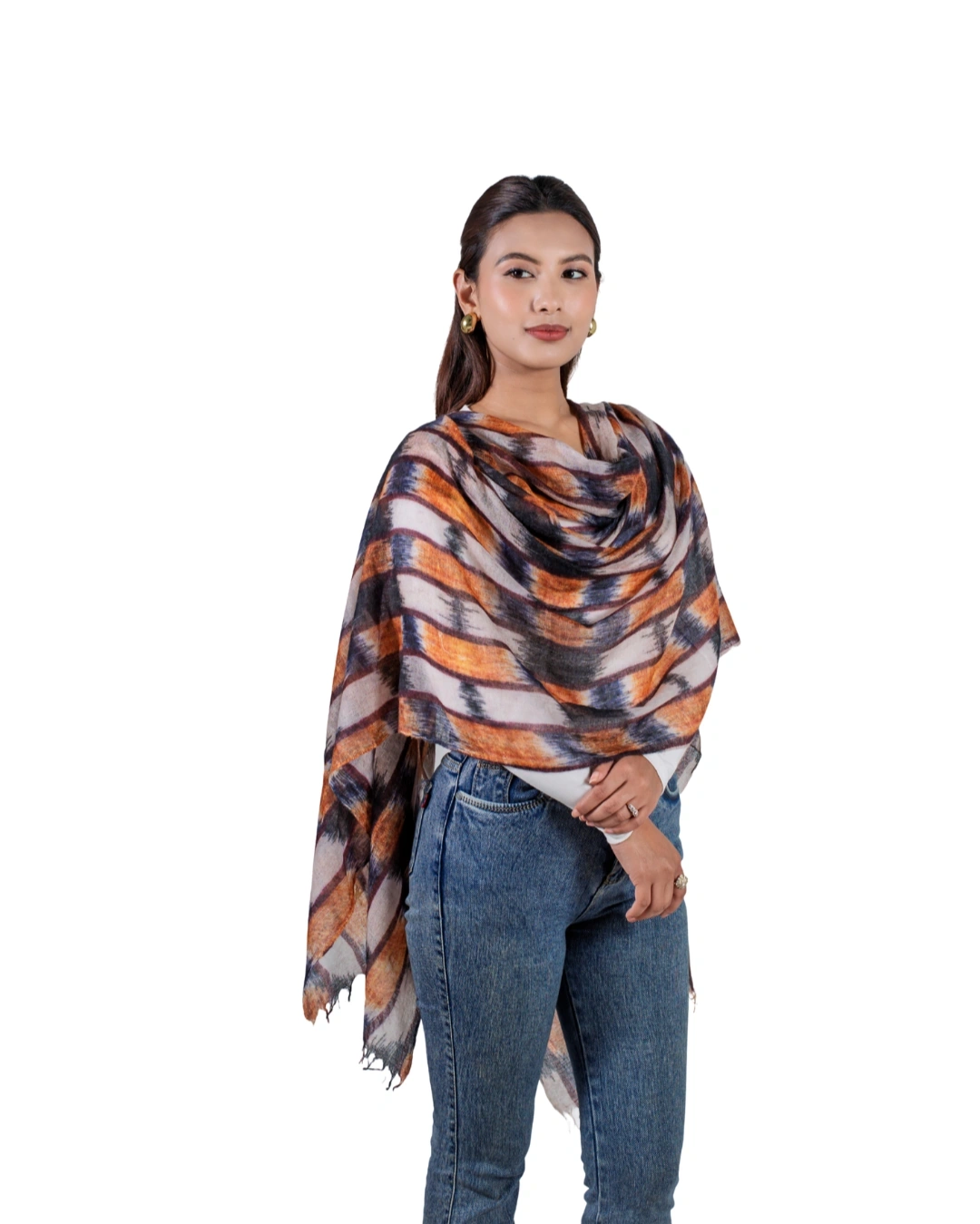 Crafted with a striking black and rust geometric design, this shawl offers a soft, lightweight, and versatile drape. Perfect as a wrap, stole, or statement accessory, it adds a touch of contemporary elegance to both formal and everyday outfits.