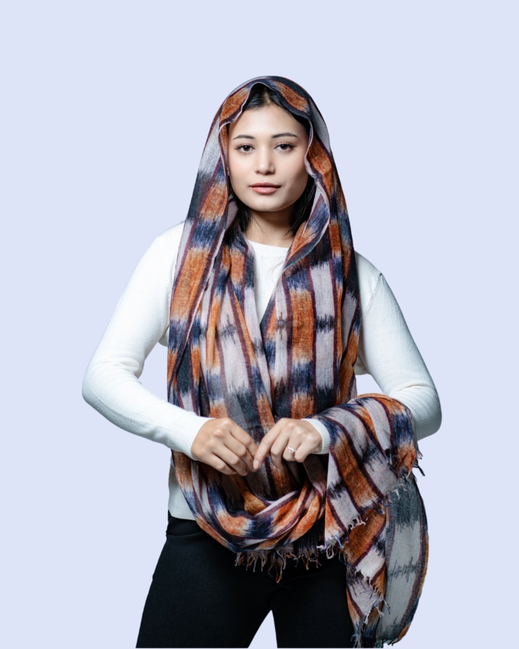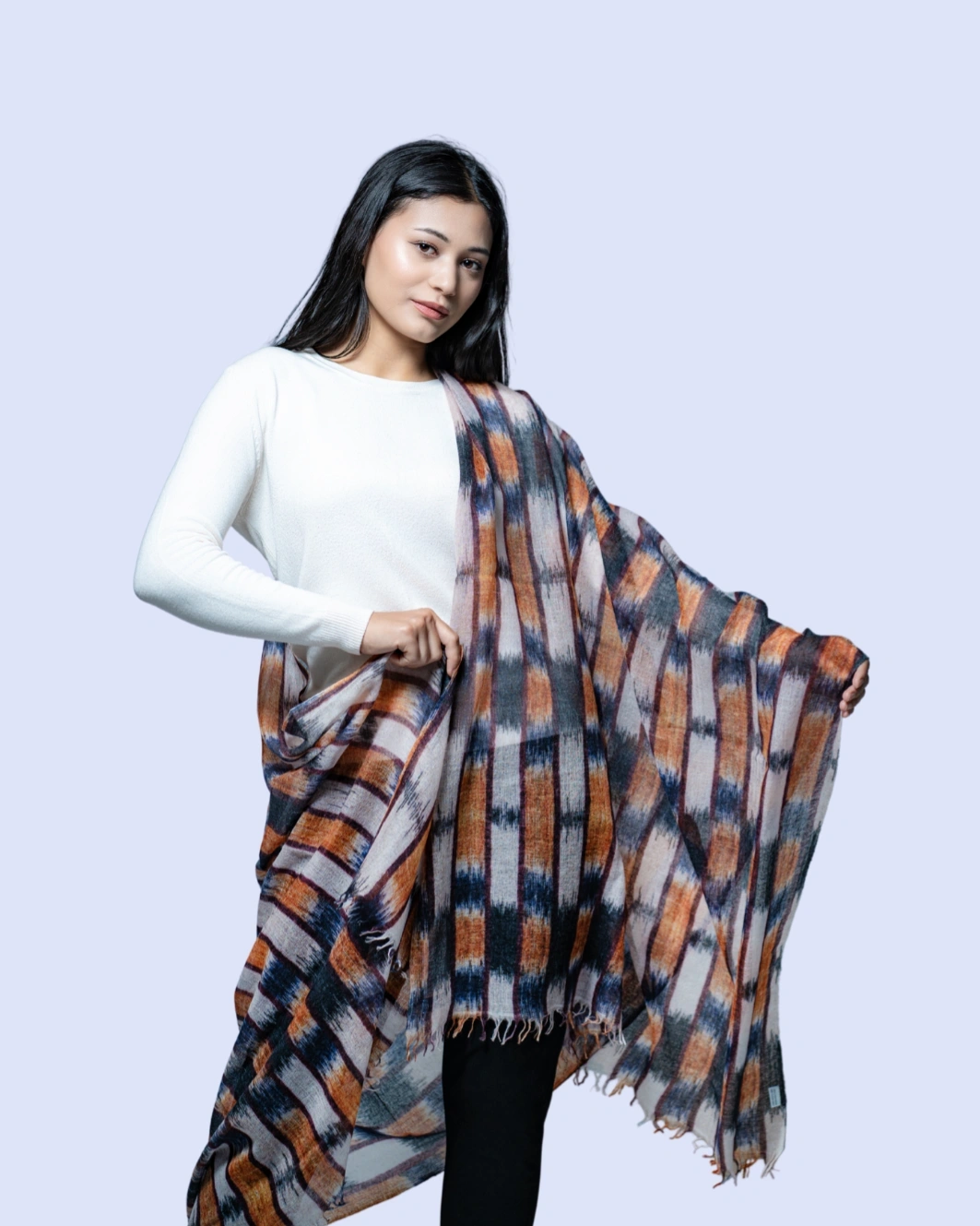 Crafted from 100% pure cashmere, this shawl features a bold black and rust geometric pattern. Soft, lightweight, and versatile, it drapes effortlessly as a wrap, stole, or statement accessory, perfect for both formal occasions and everyday elegance.