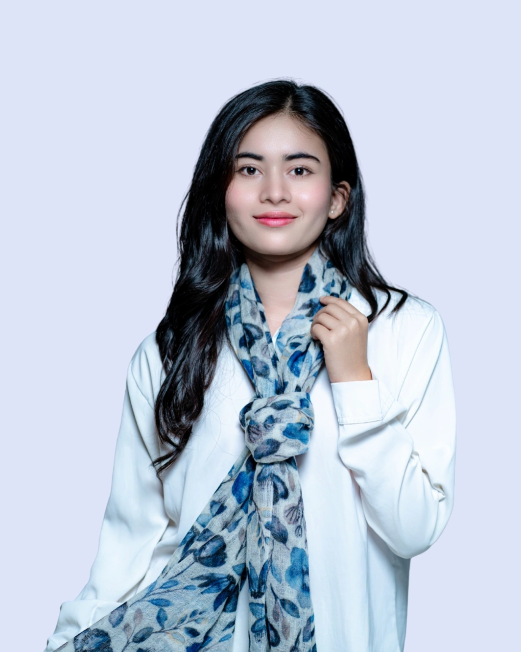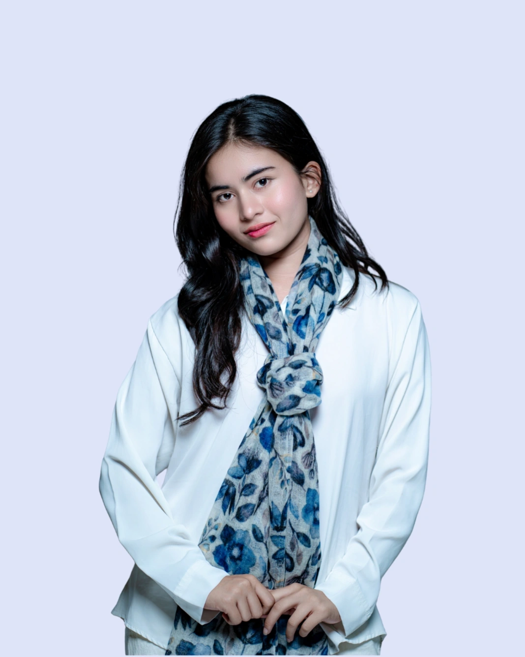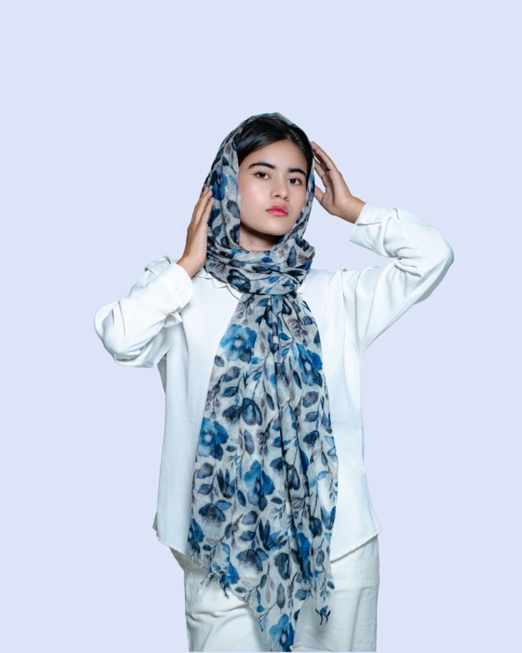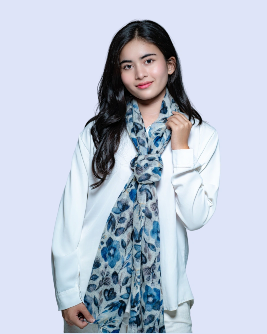 Crafted from 100% pure cashmere, this scarf features a delicate blue frangipani floral print. Soft, lightweight, and elegant, it drapes effortlessly as a wrap, stole, or statement accessory, perfect for both formal occasions and refined everyday wear.