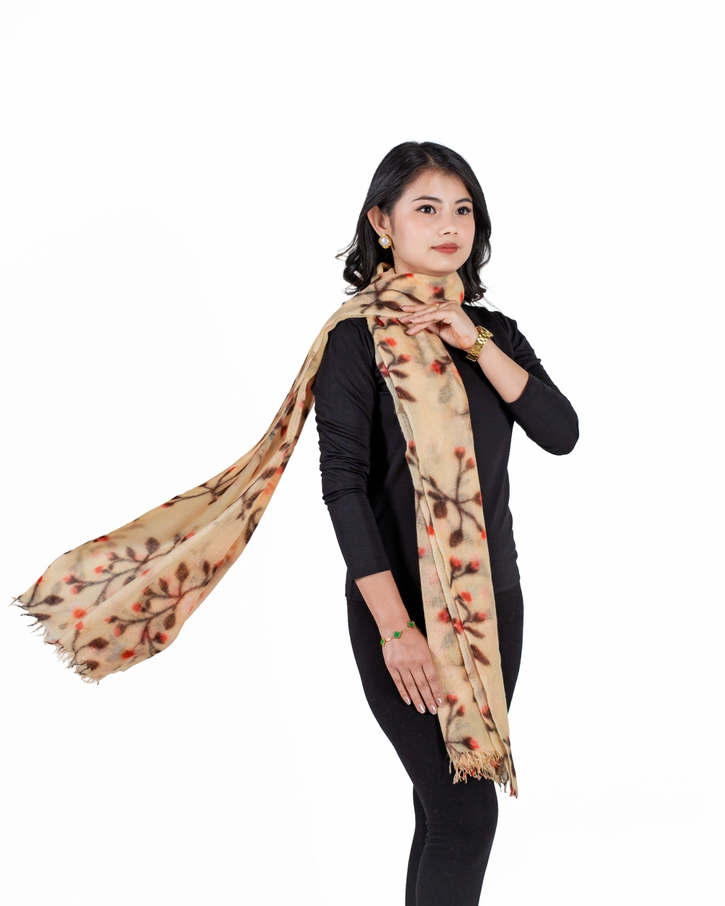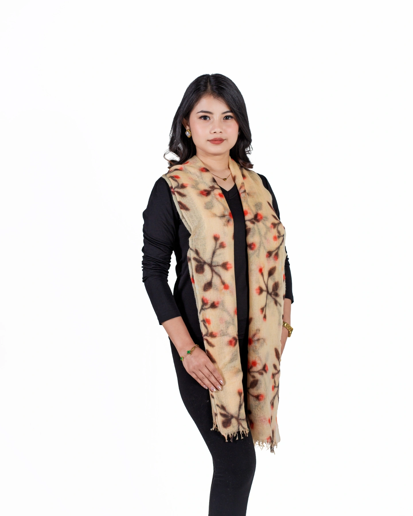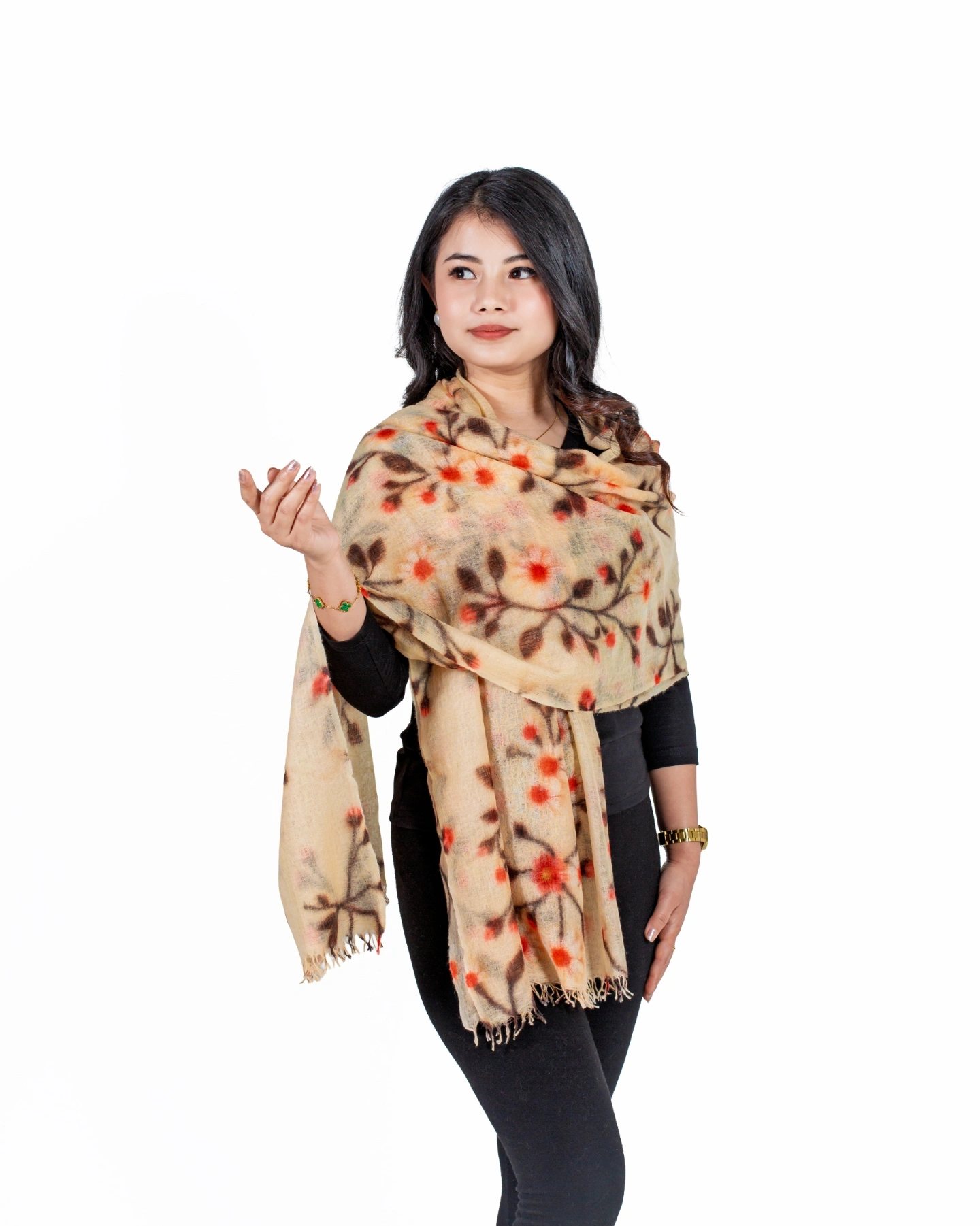 Crafted from 100% pure cashmere, this shawl features a delicate botanical-inspired design. Soft, lightweight, and elegant, it drapes effortlessly as a wrap, stole, or statement accessory, perfect for both formal occasions and refined everyday wear.