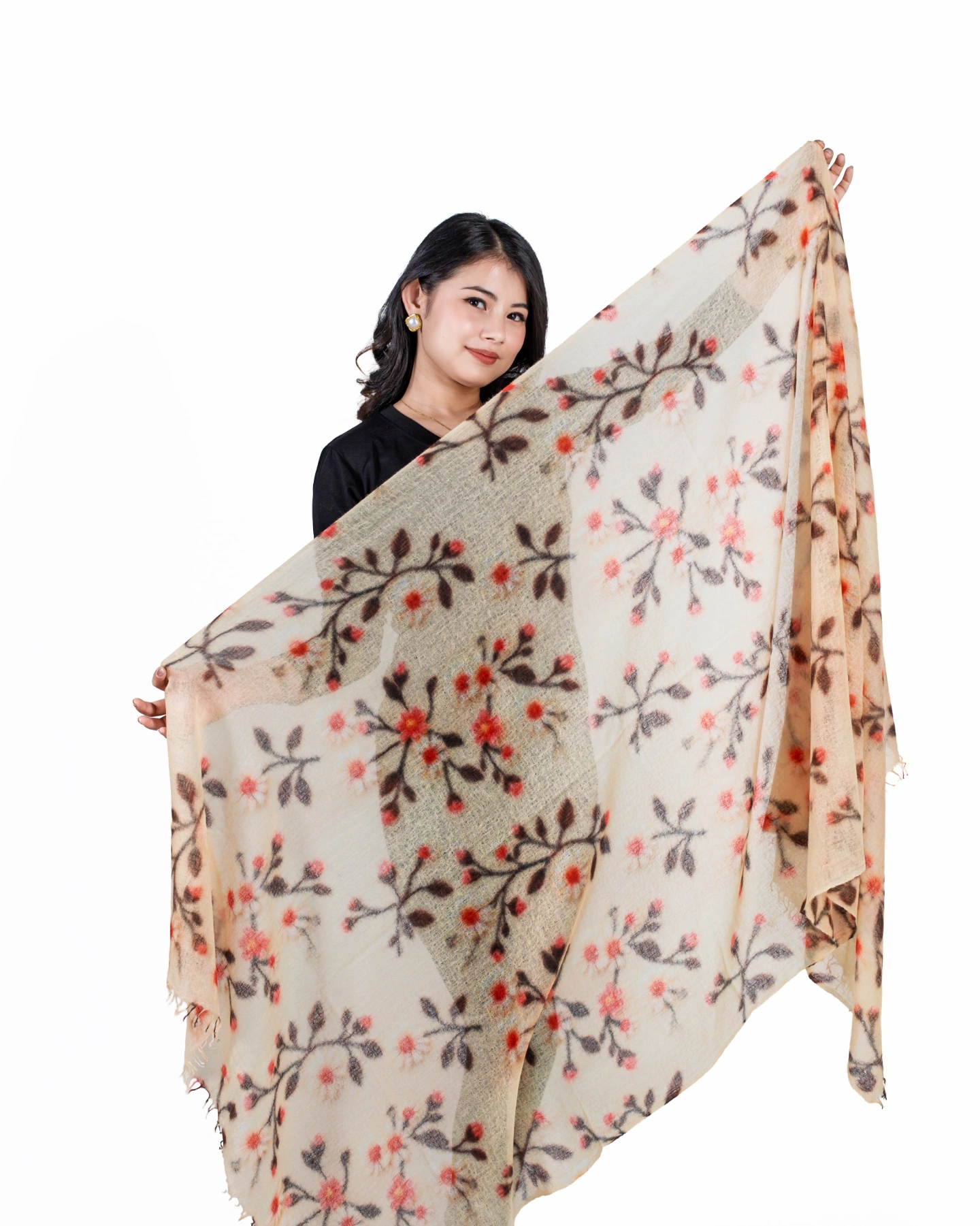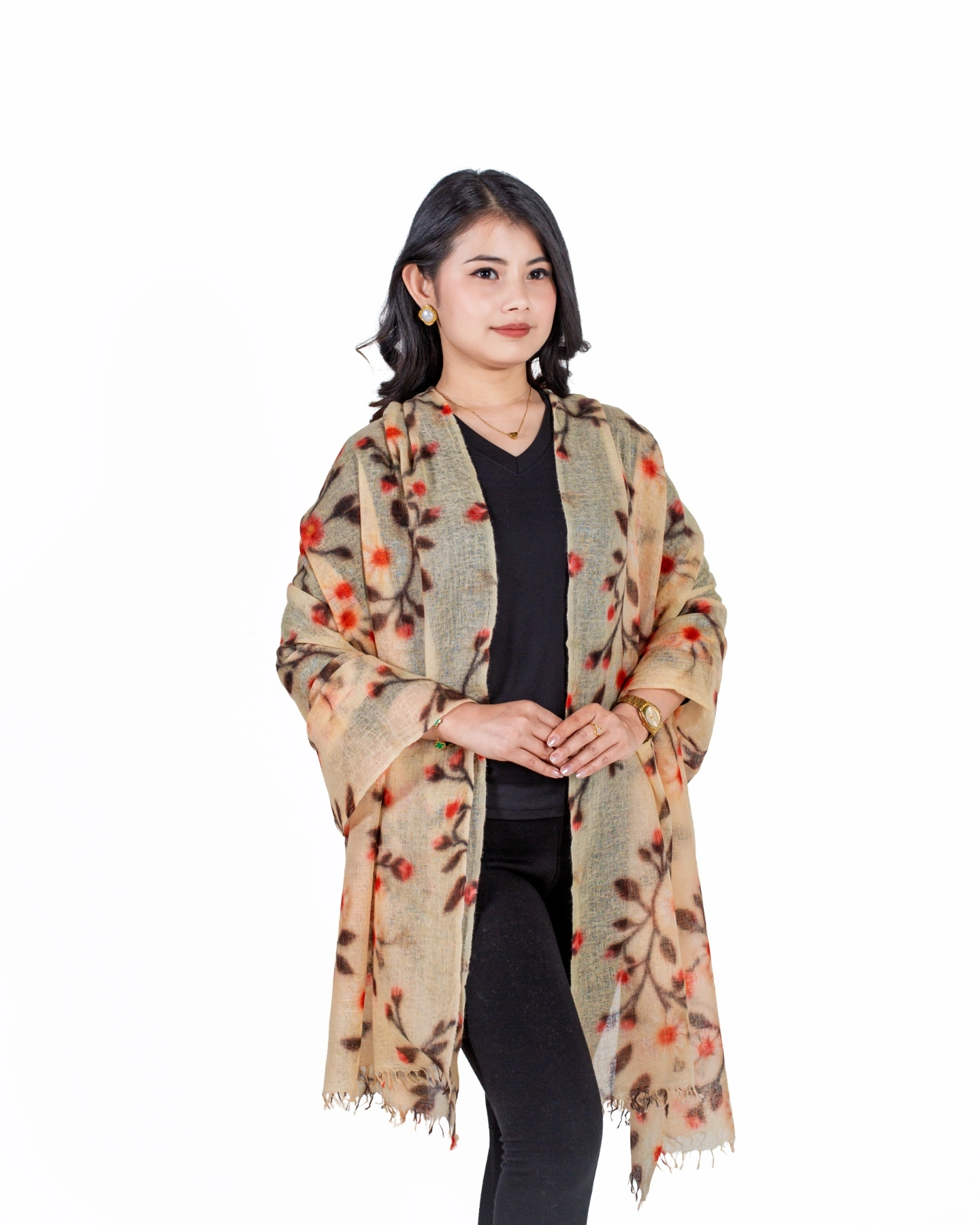 The delicately printed botanical motifs add a touch of nature-inspired sophistication, while the finely finished edges reflect meticulous craftsmanship. Its versatile design makes it perfect for formal occasions, special events, or elevating everyday outfits with understated luxury. Lightweight yet indulgently warm, this shawl provides comfort year-round while maintaining a refined, elegant presence.