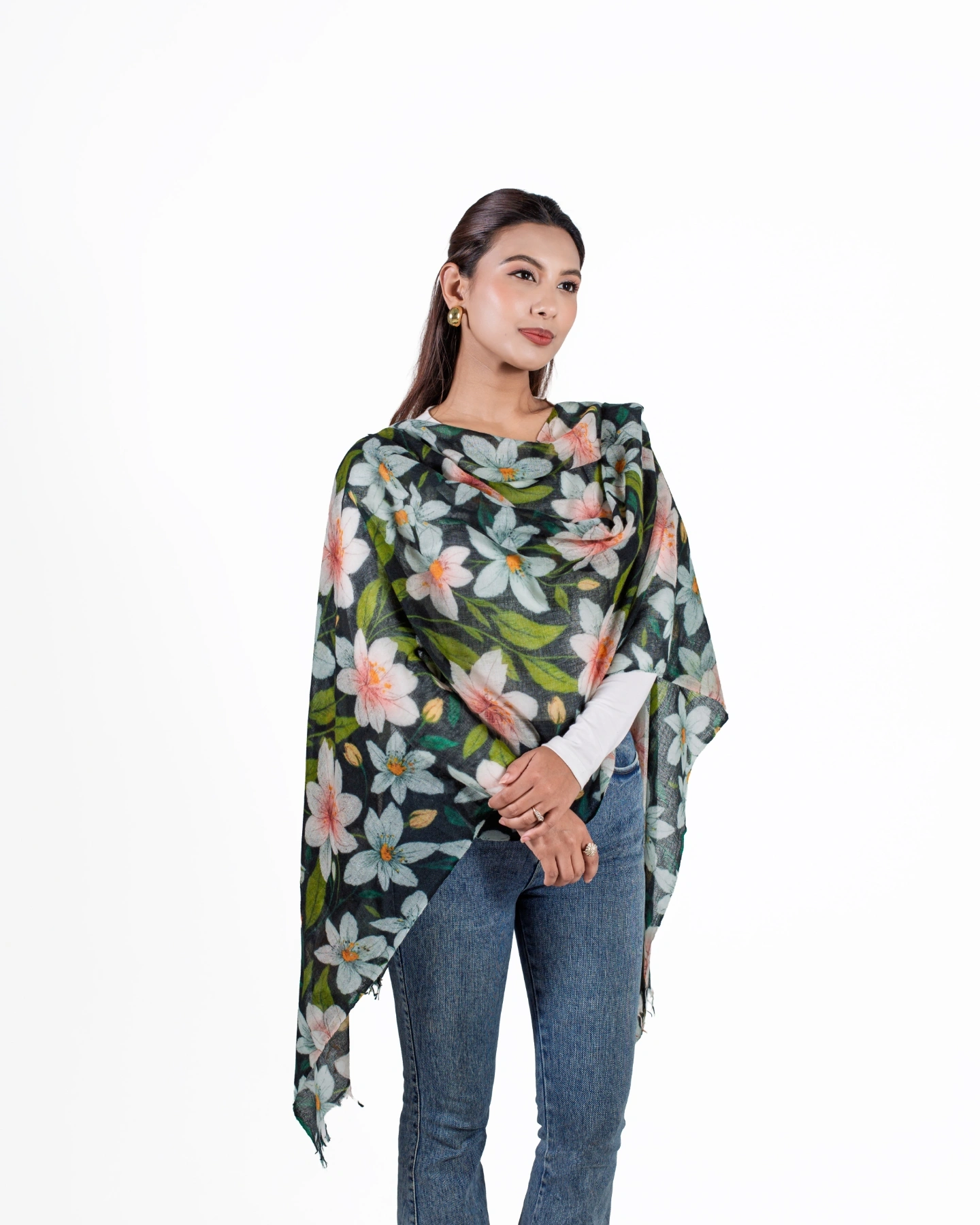 Crafted from 100% pure cashmere, this shawl features an elegant exotic blue floral design. Soft, lightweight, and breathable, it drapes beautifully as a shawl, wrap, or statement accessory, perfect for both formal occasions and refined everyday wear.